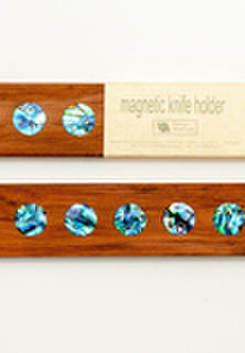 This stylish knife holder uses strong magnets hidden behind paua shell to firmly hold the knives in place.